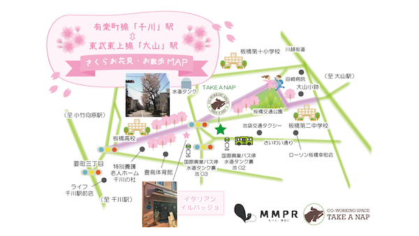 板橋区大山駅と豊島区千川駅を結ぶ道のある地域周辺のお散歩&休憩場所マップです。