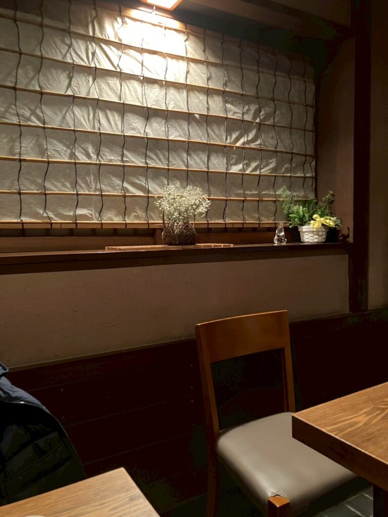格子の窓からこぼれるやわらかな灯り、和紙を使った内装どこを見ても気取りがなく、落ち着いた和の空気がゆっくりと流れる空間。