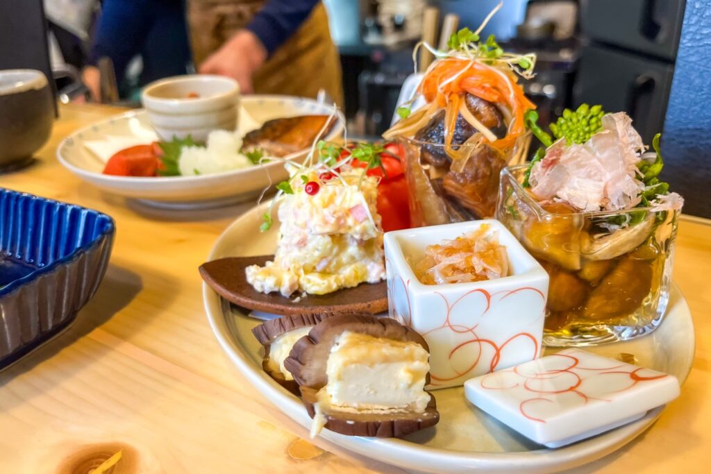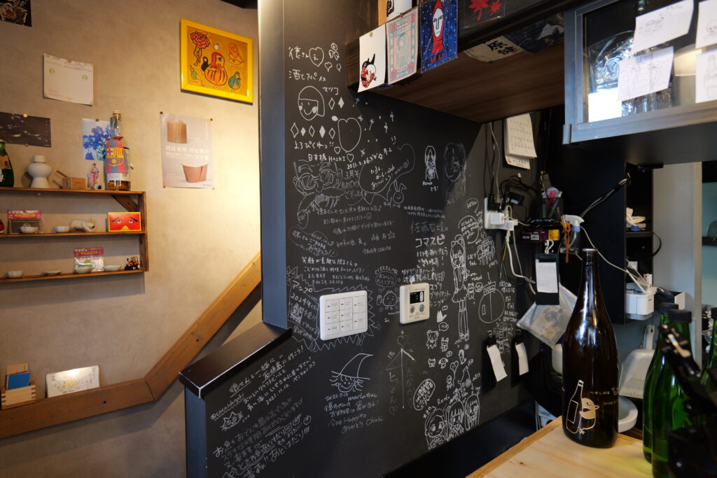 2階にはテーブル席もあり、少人数のグループで利用することも可能です。友達との会話を弾ませたり、ゆったりと仲間でくつろぐには2階がお勧めです。 店内のデザインは、お知り合いのデザイナーさんにご依頼されたとのことで、とてもお洒落。落ち着いた雰囲気で日本っぽいのに、とても新しい感じ。仲間とでも、カップルでも、1人でも楽しむことができるそんなインクルーシブな雰囲気が店内いっぱいに広がっています。品揃えが沢山あるお酒の瓶やお皿やおちょこも可愛らしかったり、見たことが無い様なお洒落なデザインだったりと初めて入るとキョロキョロ見回ってみたくなって楽しいです。