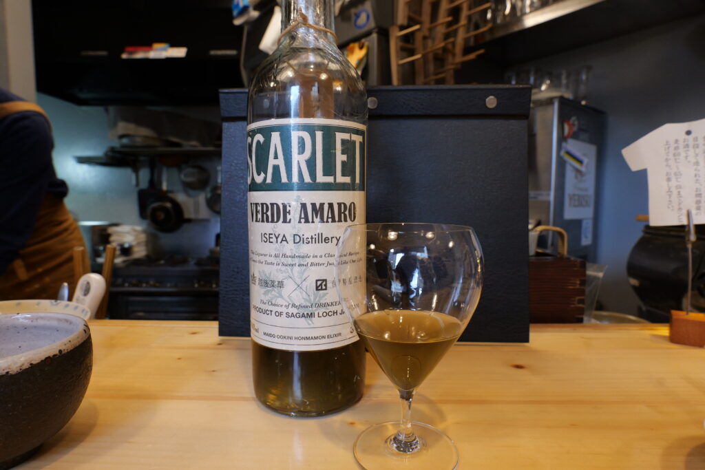 また、豊富なお酒の種類は日本酒だけではなく、日本でつくられたウイスキーの品ぞろえにもこだわられており、イチローズモルトやアマハガンなど沢山のラインナップがあり、好みや料理にあわせて、楽しむことができそうです。特に”おすすめ”としてご紹介いただいたのが「スカーレット」というリキュールです。スカーレットは、イタリアのアマーロを元にし、伊勢谷酒造さんによって日本で製造され、その品ぞろえに対する豊富さは、”ここの辺では一番!最も充実している!とのこと。頂いた種類は、苦味と複雑な風味が特徴で、香り豊かなハーブの味わいが楽しめて、とても美味しいお酒でした。
