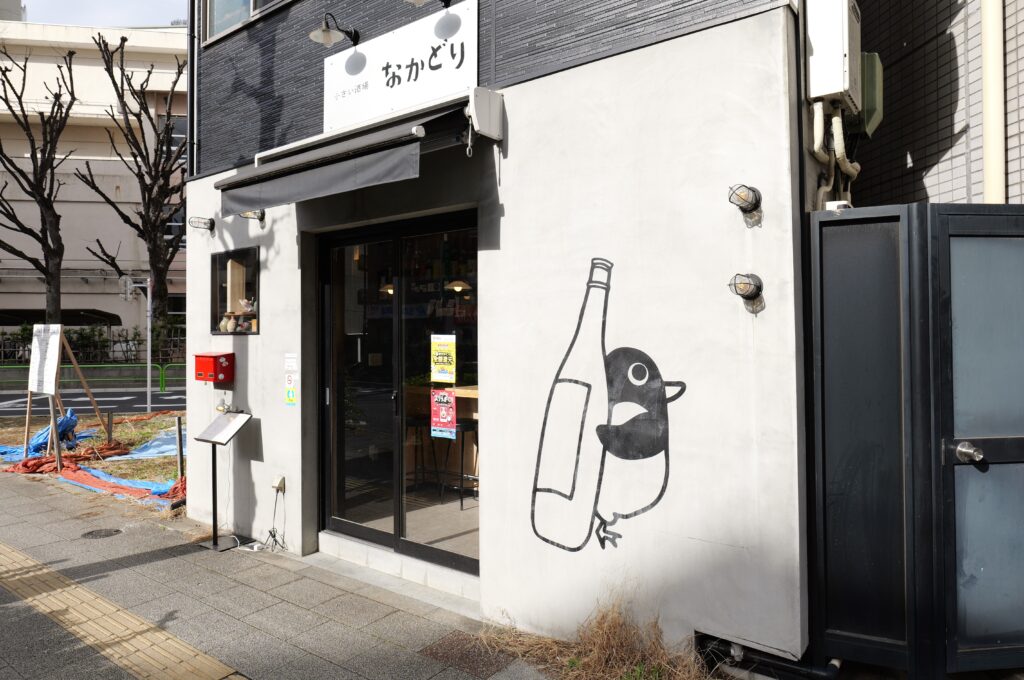 なかどりさんは創業から4年とフレッシュさのある、大山駅から徒歩5分、千川駅からもアクセスが良く、TAKE A NAP大山幸町店の窓からは見つめあうような場所にあって、川越街道を挟んで反対側に位置するおしゃれな居酒屋です。目の前にバス停もあり、バスでのアクセスも容易です。外観にはお酒を抱えた可愛らしいペンギンのロゴが目を引き、店内に入ると、1Fはバーのような雰囲気です。
