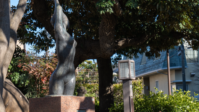 今まで公園が一つもなかった千川一丁目に初めてできた貴重な公園です。規模は小さいのですが園内は砂場や遊具のある子供たちの遊び場と石組みや枯山水のある庭園風の空間で構成されています。また、この公園の元地主から寄贈されたものを含め4体のブロンズ像がありこの公園の気品を高めています。